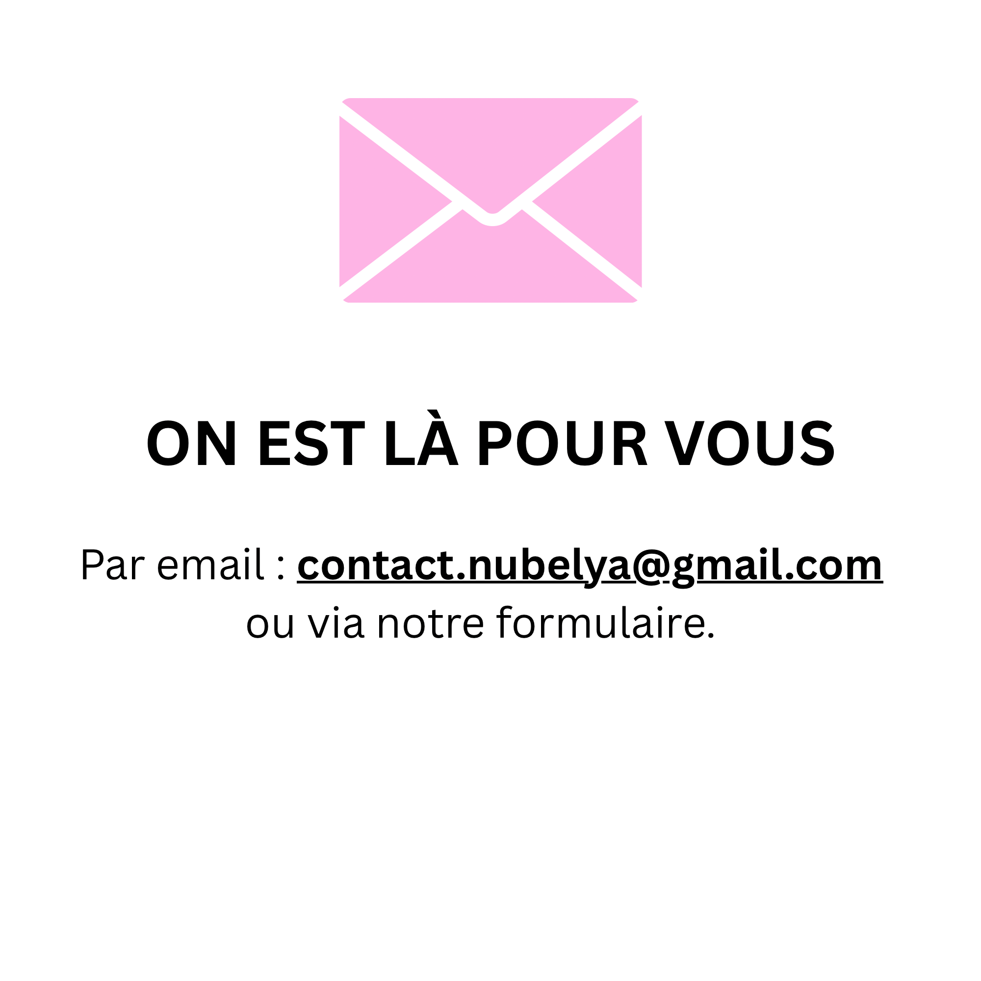 - Par e-mail : envoyez-nous un message à contact.nubelya@gmail.com, et nous vous répondrons dans les plus brefs délais.